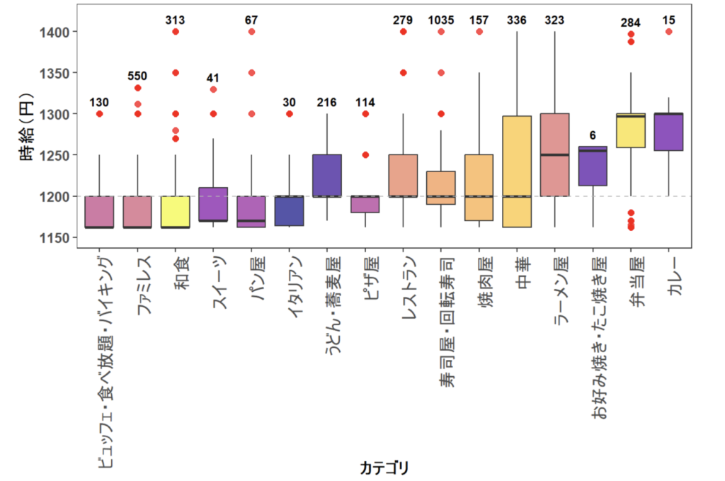 分析ではっきりとしたのが、レストランのカテゴリごとに異なる提示時給の中央値の差です。ひだりから4番目までの箱ひげ図をみてください。