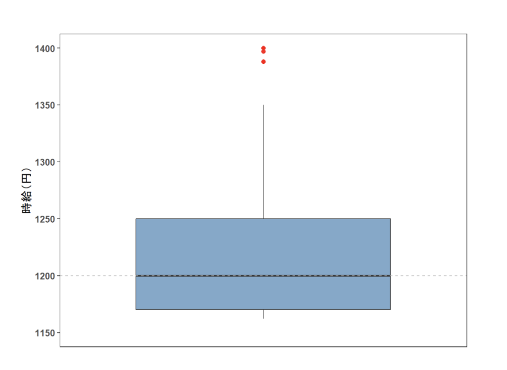 今回の時給データに当てはめてみると、真ん中の50%の求人がおおよそ1170円〜1250円の間に集中していることがわかります。