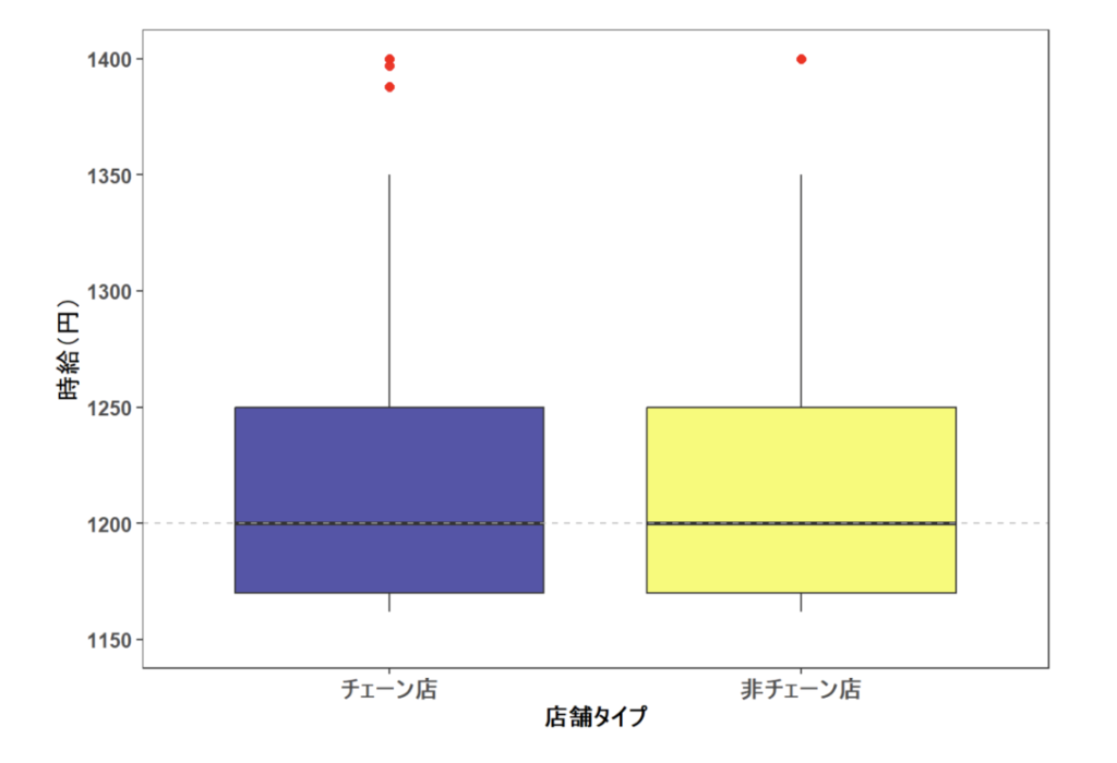 結論として、箱ひげ図の形状と中央値が一致していることから、「非チェーン店だからといって、必ずしも時給を高く設定する必要はない」と言えるでしょう。