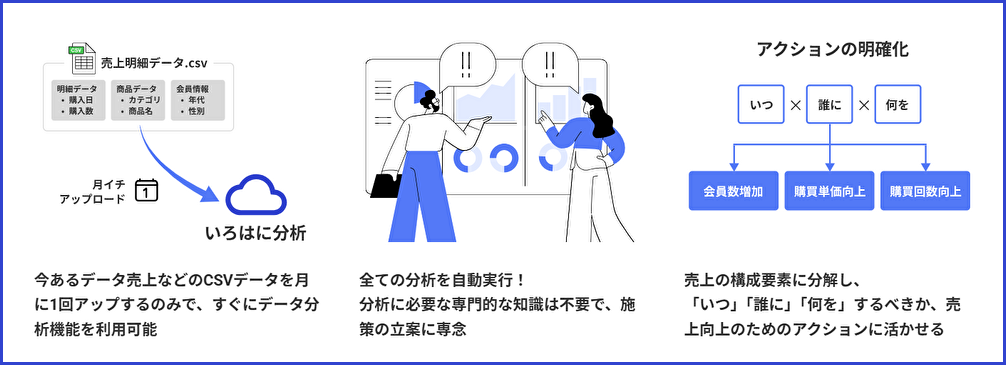 『いろはに分析』は、売上状況の集計・可視化、新規会員分析、離反会員分析、リピート分析といったマーケティングに必要な分析機能を標準搭載し、分析処理をすべて自動実行します。