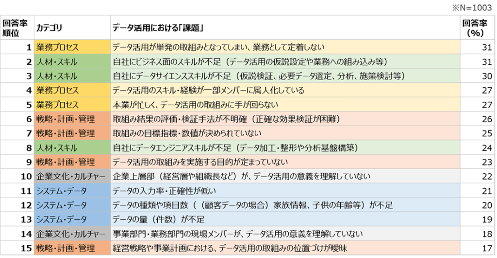 ここに、データ活用における「課題」について、次のような調査結果があります。