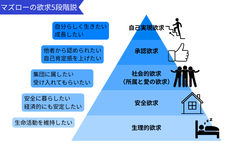 このような心理構造を理解するうえで、マズローの欲求5段階説が用いられることが多いです。