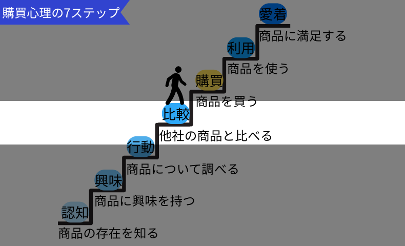 例えば、下の図のように購買心理の7ステップの比較段階にいる顧客には、他社商品との違いや自社のメリットを伝え、