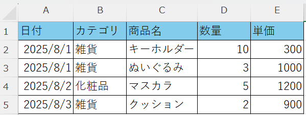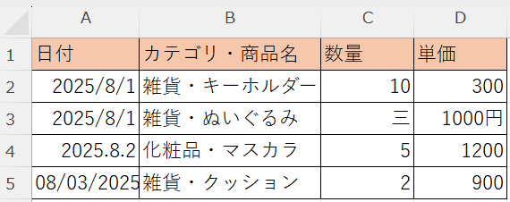 下の図では、1つのセルにカテゴリと商品名の複数のデータが入っている他、日付・数量・単価の表記にもバラつきがあるので、