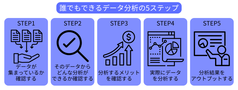 データ分析はプロに任せるのが効率的ですが、以下のような手順で自分でも分析にチャレンジしてみるのもおすすめです。