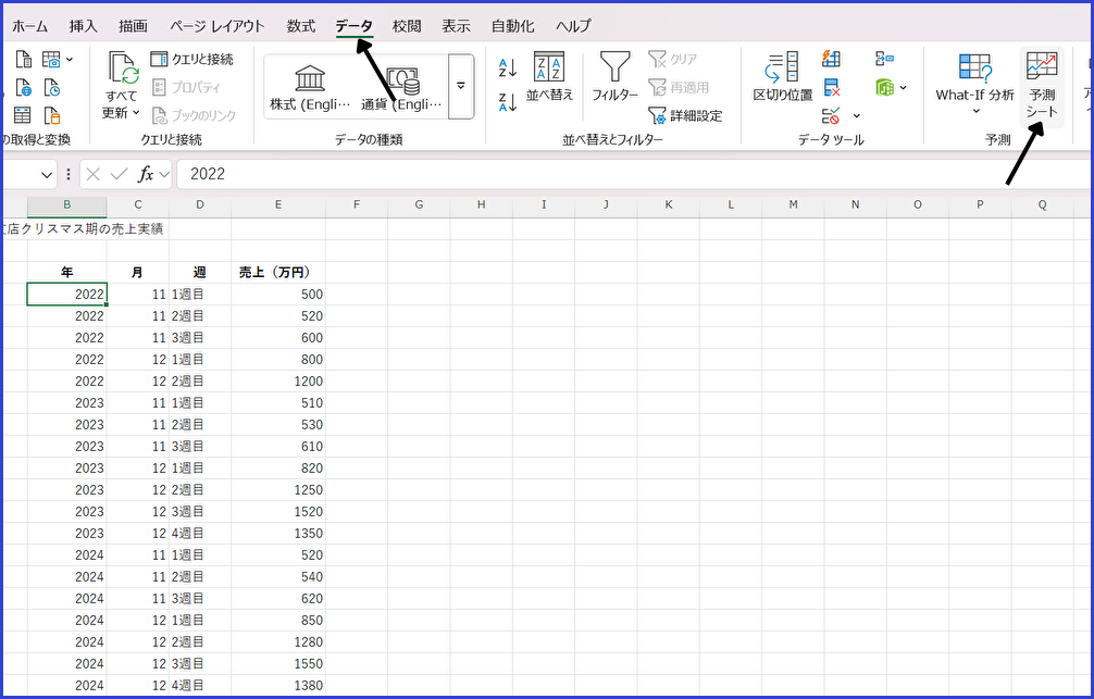 - データを選択した状態で、[データ]タブ → [予測シート] をクリックします。