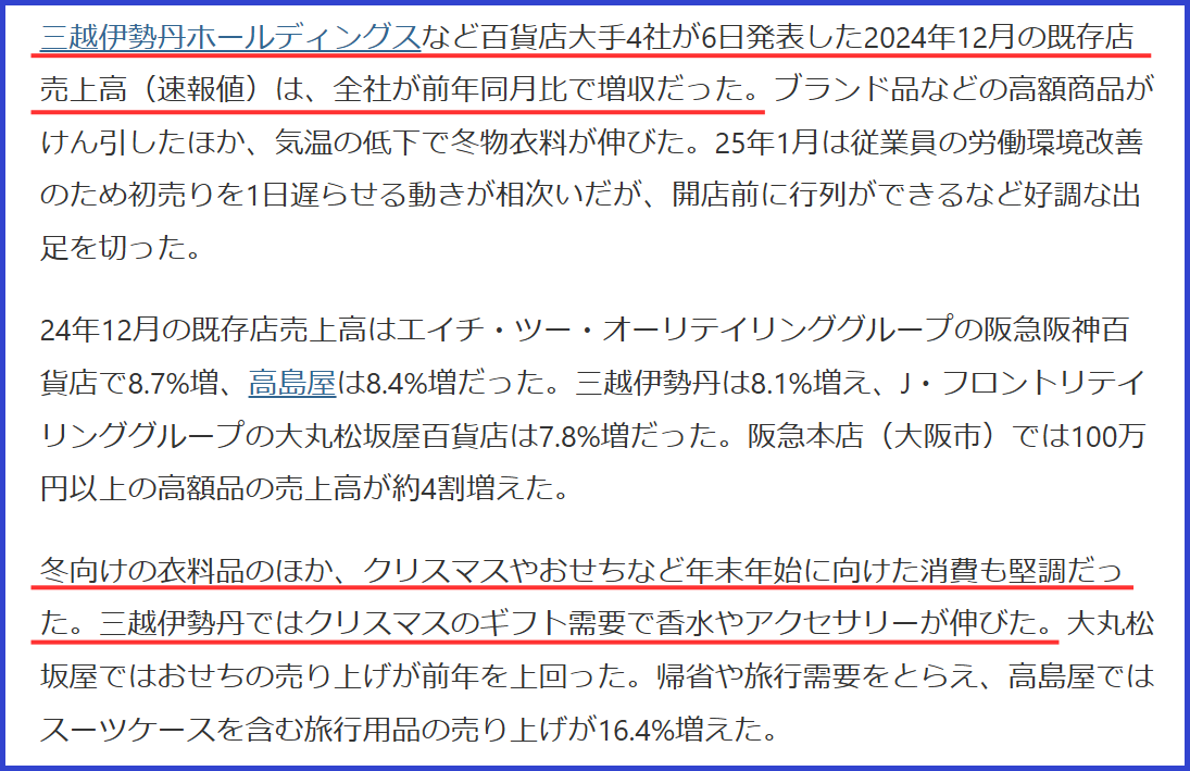 また、複数の百貨店では、2024年12月の売上高が前年同月比で増収しました。