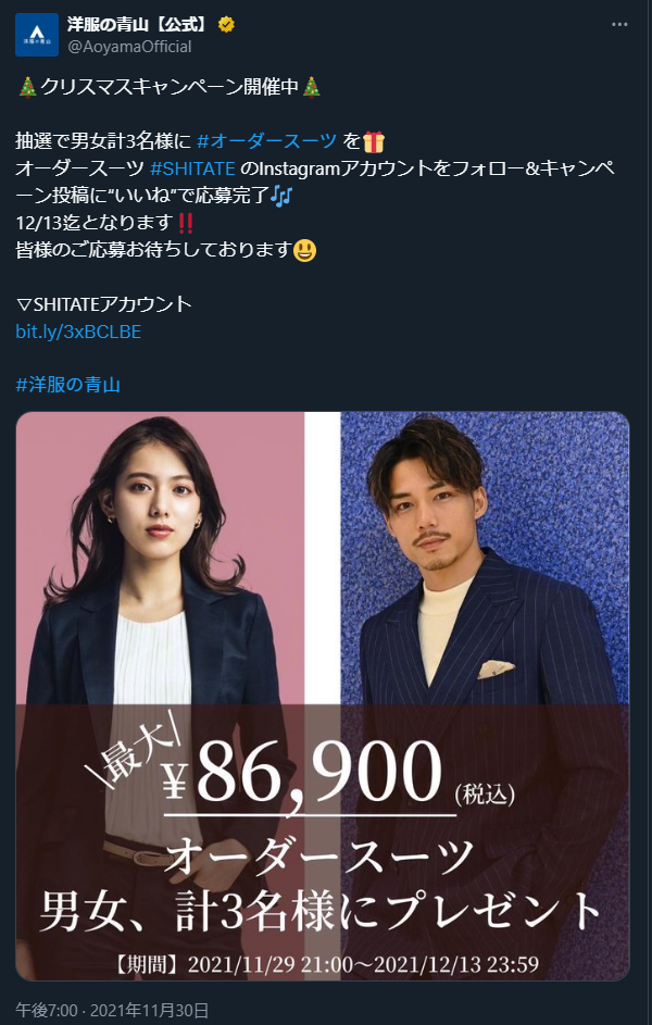 紳士服・婦人服の販売を行う洋服の青山は、2021年のクリスマスキャンペーンとして、11月29日~12月13日まで、Instagramをフォロー&いいねした人の中から抽選でオーダースーツをプレゼントしていました。