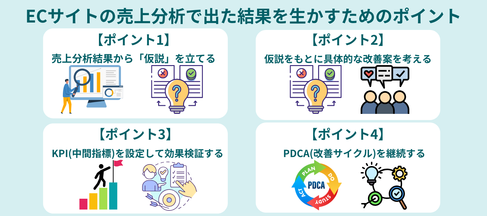 ここでは、ECサイトの売上分析で出た結果を生かすためのポイントを4つ紹介します。