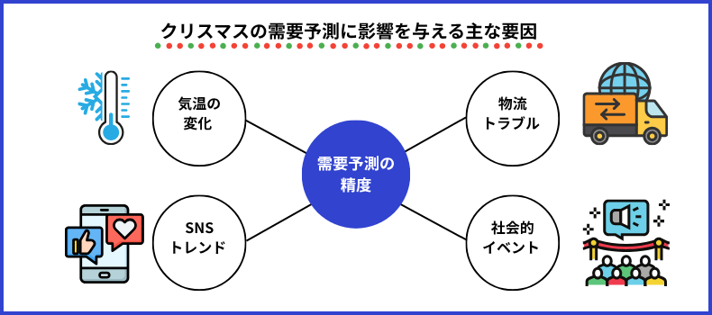 例えば、クリスマス前に寒波が到来すれば防寒ギフトが急に伸びたり、SNSで特定商品が話題化すれば一気に需要が変動します。