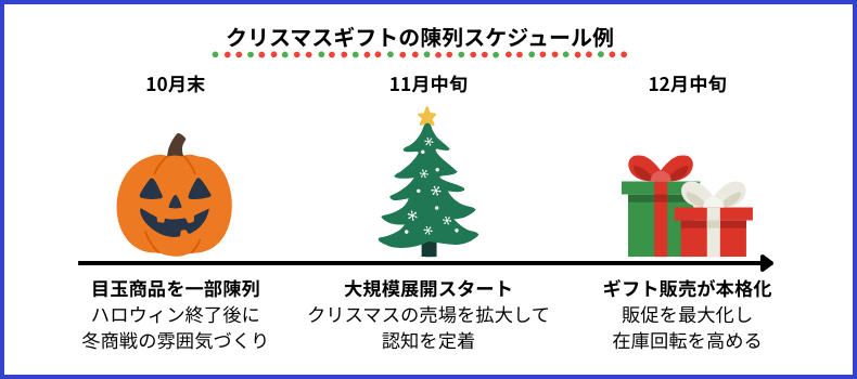 早い段階で陳列することで、「この店はもうクリスマスギフトを売り出している」と顧客の印象に残り、比較検討の候補に入りやすくなるのです。