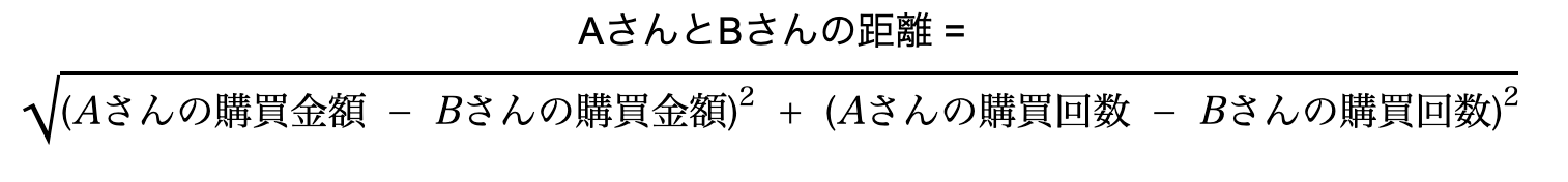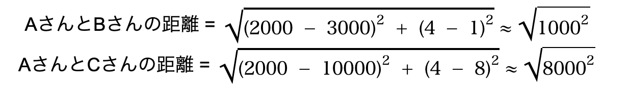 これをAさんとCさんの距離も計算して比較すると、どちらに近いかというのがわかります。クラスタリングでは、このような計算をあらゆる組み合わせで実施し得られた距離の比較によって、近いもの同士をグループ化することができるのです。