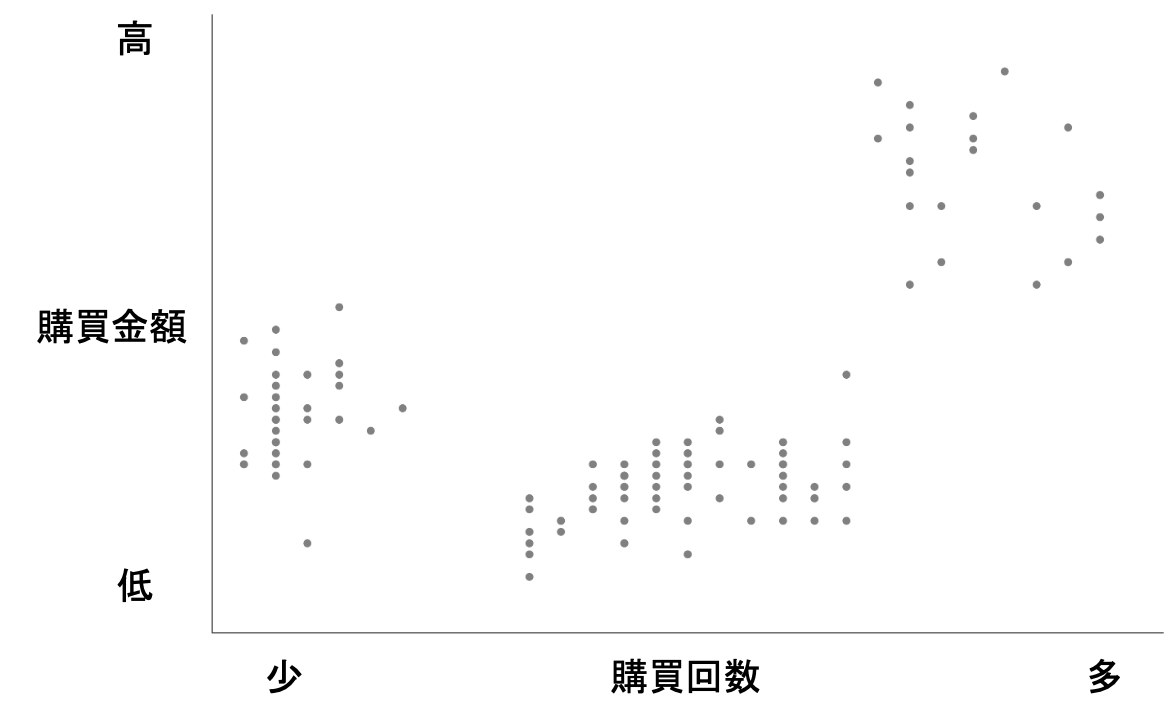 今回の例は購買回数と購買金額の2つの変数なので、散布図で、わかりやすく見ることができます。