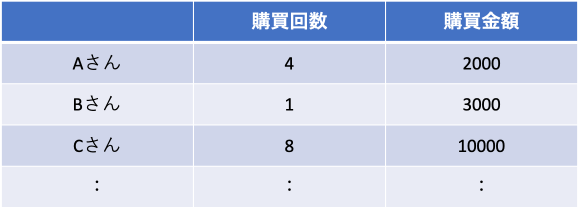 今回は購買回数と購買金額に関するお客さまのデータを使って、似た特徴のお客さま同士で、いくつかのグループに分けることを目指します。