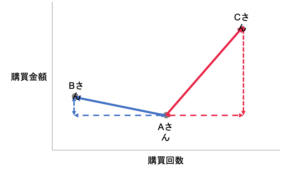 一方で今回の例で注意しなければならないのが、購買金額、購買回数の値をそのまま使ってしまうと次のようになります。
