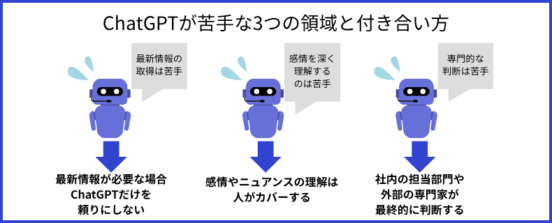 特に、最新情報の扱い、感情やニュアンスの理解、専門家としての最終判断は、すべてをChatGPTに任せるのではなくユーザー側で補う必要があります。