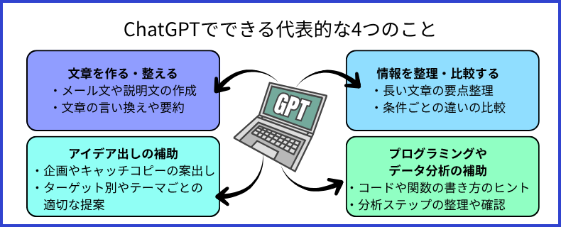 ChatGPTでできることは多岐にわたりますが、代表的な使い方は「文章を作る・整える」「情報を整理・比較する」「アイデア出しや企画を補助する」「プログラミングやデータ分析を補助する」の4つに整理できます。