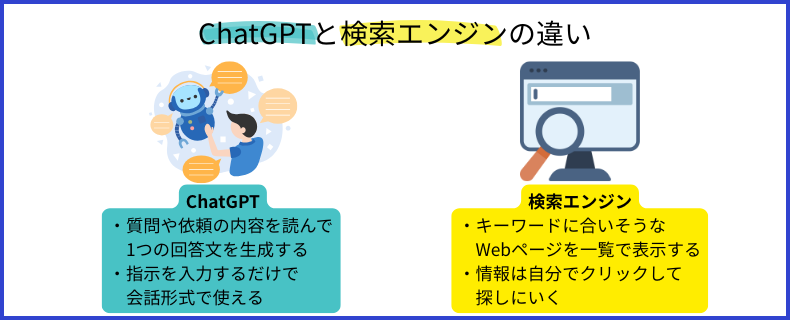検索エンジンのように関連ページの一覧を返すのではなく、質問内容を踏まえて1つの回答文をその場で生成します。