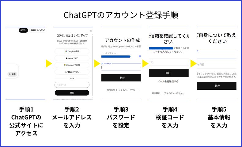 ChatGPTの登録手順は、次のようなステップで進みます。