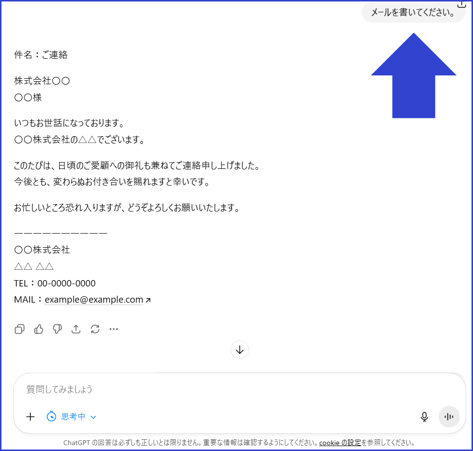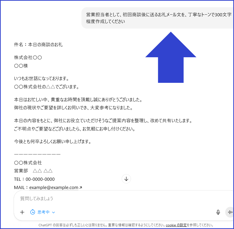 例えば「営業担当者として、初回商談後のお礼メール文を300文字程度で作成してください」のように、役割・目的・文字数を伝えると、下書きとなる文章を短時間で生成してくれます。