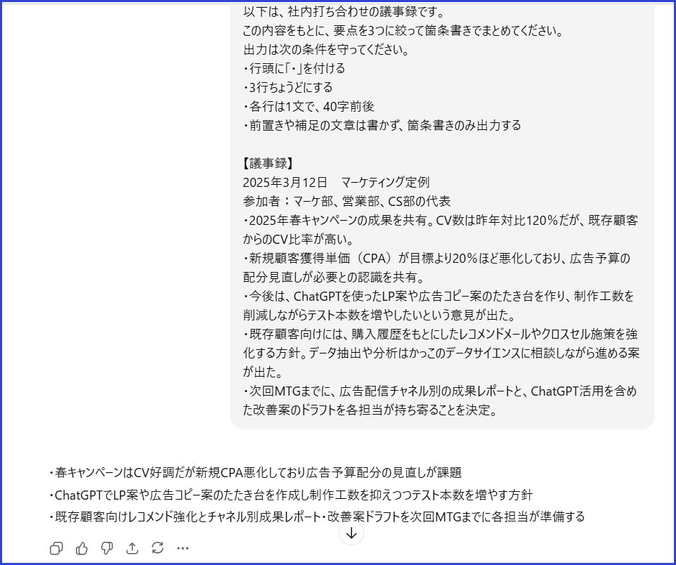 - ③ 必要に応じて途中から「マーケティング担当者として」「箇条書きで3点」など役割や制約条件を加え、形式や視点を調整する