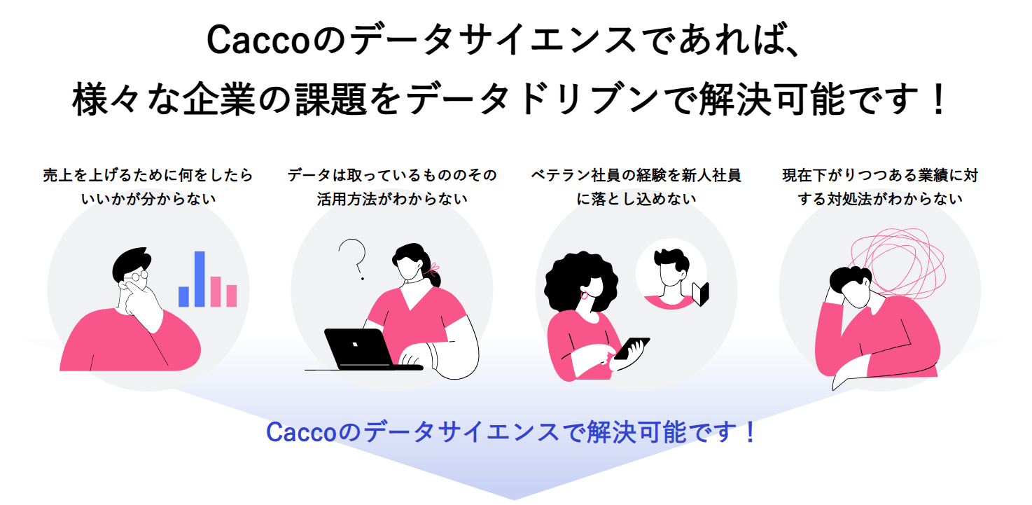 『Caccoのデータサイエンス』は、事業の目的整理から、データ整理、課題解決の提案まで無料で対応可能です。
