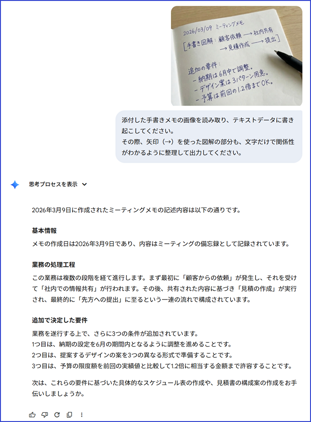 ※画面内で読み込ませている手書きメモ画像は、機能説明用にGeminiで作成したサンプルです。