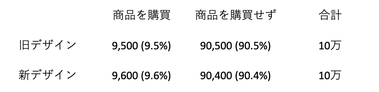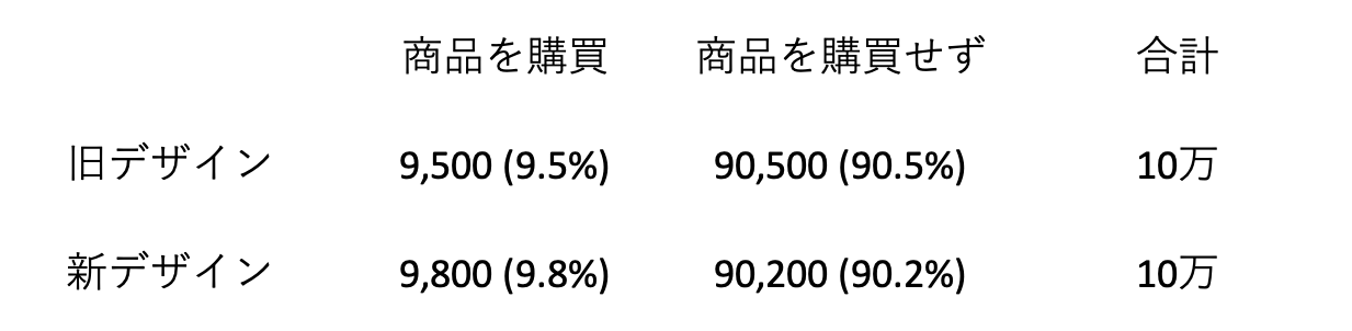 つまり、これは誤差レベルでたまたま生じた偏りであり、旧デザインから新デザインにしたところで、商品の購買に対する効果は期待できない、という結論を得たことになります。