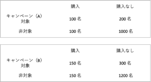 以下の例では、カイ二乗検定によって2つのビジネスに有意義な結果が得られています(キャンペーンA、Bによって購入が促されている)。ここでどちらが人数的に効果があったのか比較をしようとするならばどう判断しますか?