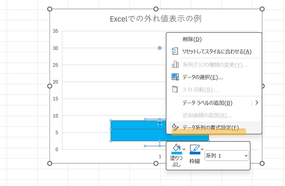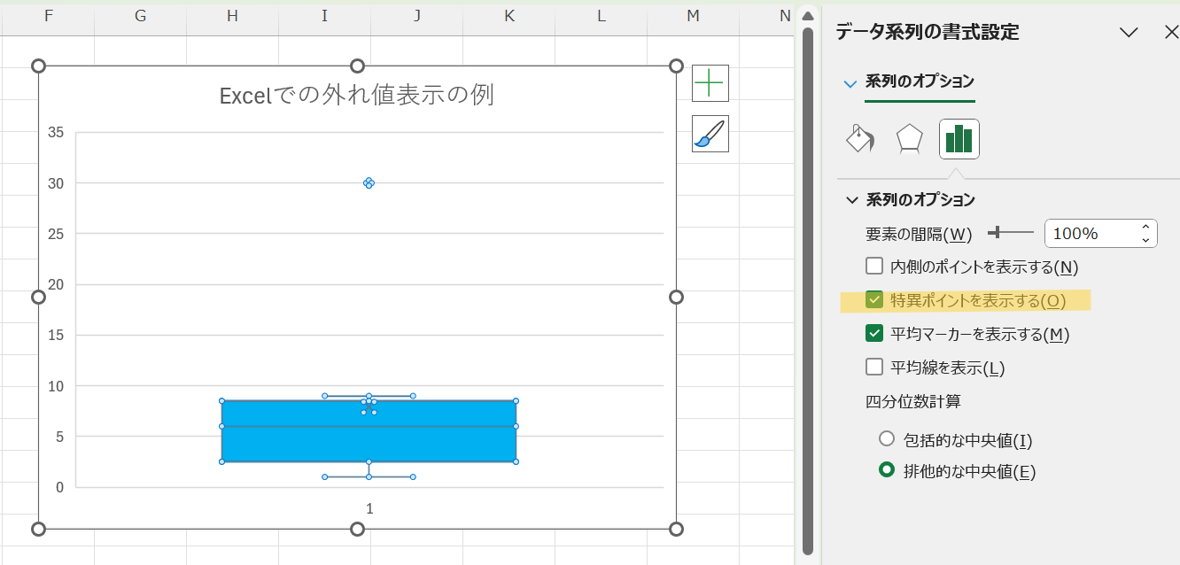 また、Excelの箱ひげ図で外れ値を表示する設定は、通常はデフォルトで有効になっていますが、非表示になっている場合や表示方法を変更したい場合は以下の手順で設定できます。