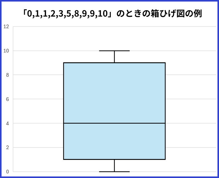 今回の例だと、Q1は「0,1,1,2,3,」の中央値の「1」で、Q3は「5,8,9,9,10」の中央値の「9」です。