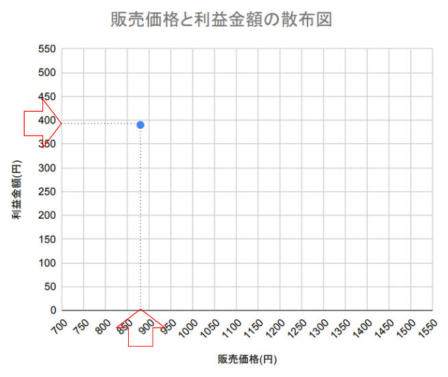例えばA社の商品は、販売価格が880円、利益金額が390円となっています。そのため、横軸が880、縦軸が390となるような線の交わる箇所に点を打ちます。
