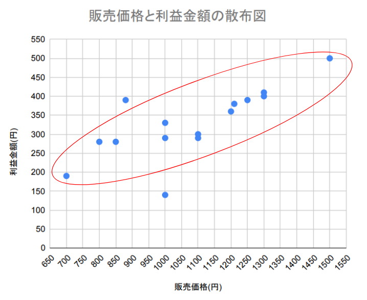このデータを見ただけだは「販売価格」と「利益金額」の関係がいまいちわかりませんが、散布図を用いるとこれらの関係が一目で分かるようになります。