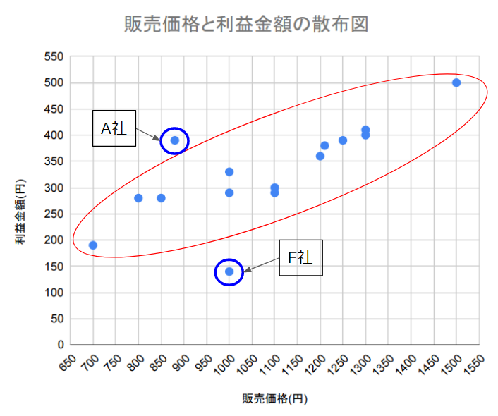 例えば、散布図の青丸で囲まれている「A社」と「F社」に注目してください。