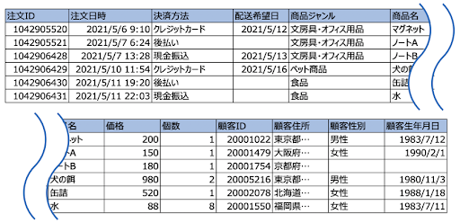 注文ID、注文日時、決済方法、配送希望日、商品ジャンル、商品名、顧客ID、顧客住所、顧客性別、顧客生年月日